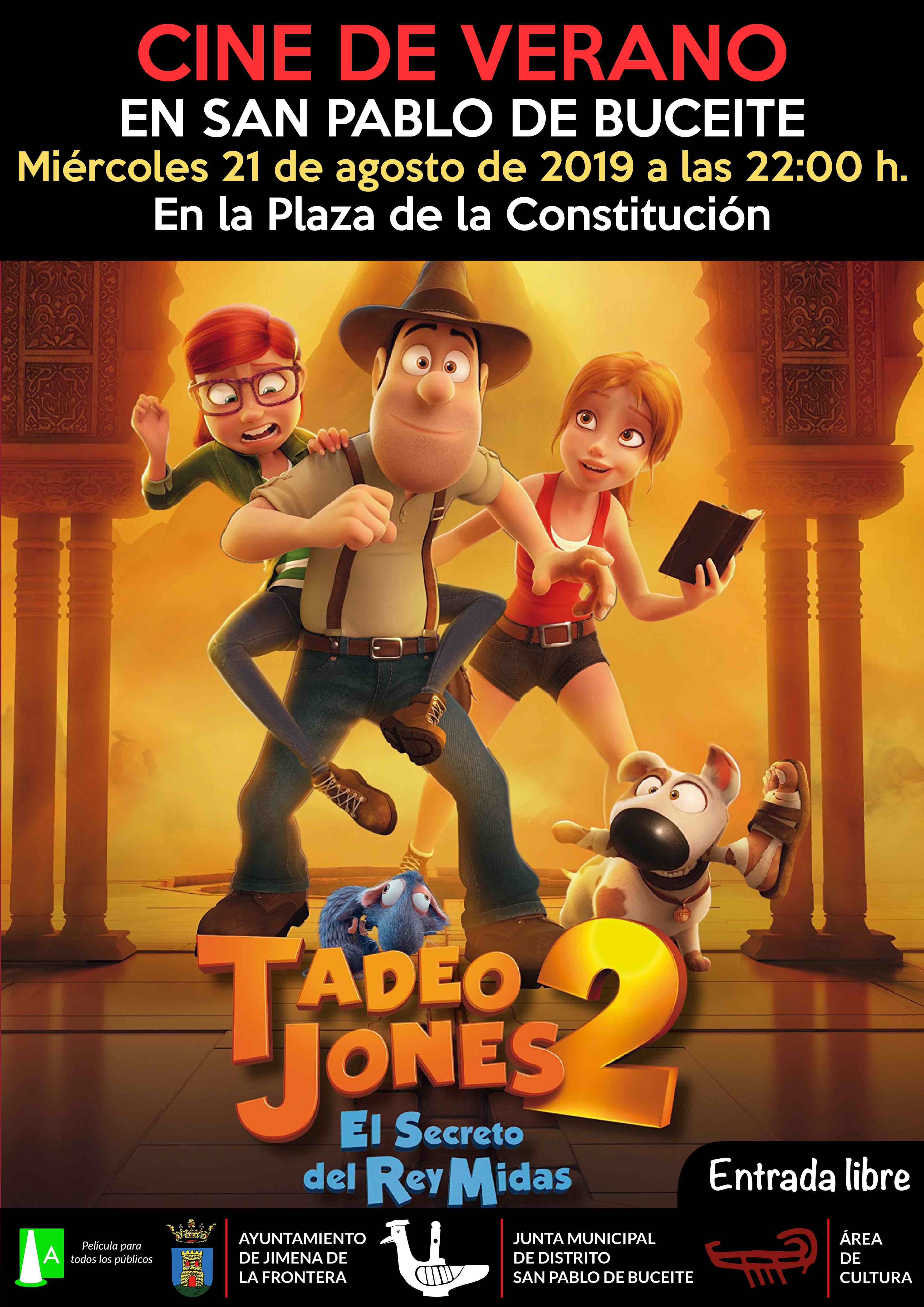 ‘Tadeo Jones 2. El secreto del Rey Midas’, la película de animación de Enrique Gato y David Alonso es la elegida para el Cine de Verano el próximo miércoles 21 de agosto en San Pablo de Buceite. Se proyectará a partir de las 22:00 horas en la Plaza de la Constitución. La entrada es gratuita.