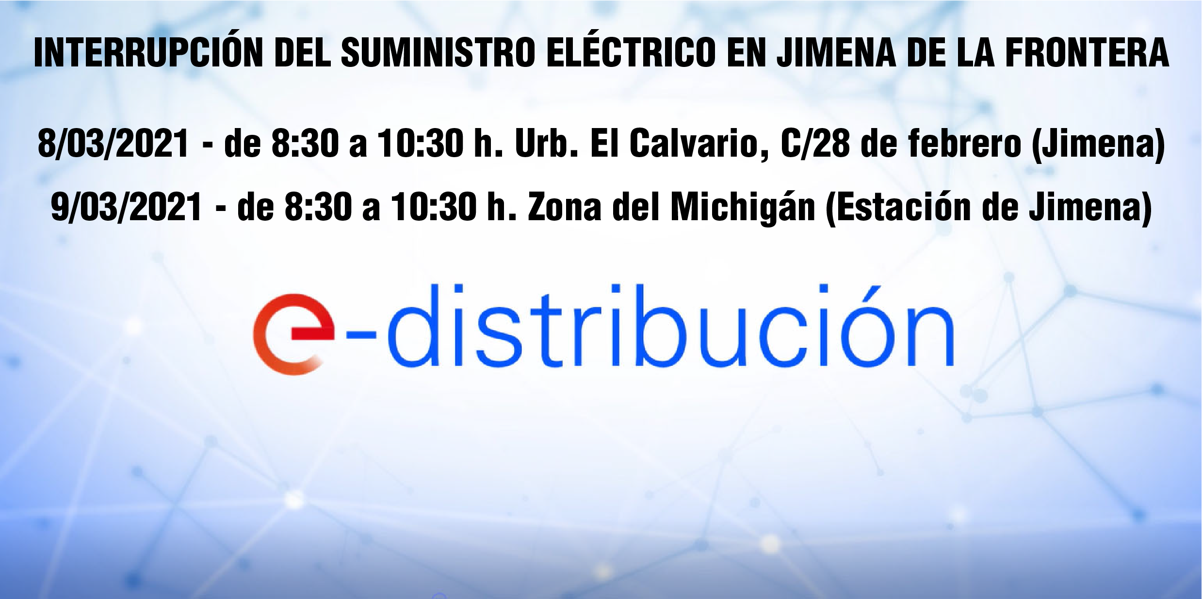 La empresa suministradora de electricidad ENDESA a través de E-Distribución, comunica que el próximo lunes 8 de marzo de 2021 entre las 8:30 y las 10:30 h. se procederá a un corte de suministro programado en Jimena de la Frontera para realizar trabajos de mantenimiento en la zona de la Urb. El Calvario, C/28 de Febrero y alrededores, y el martes 9 de marzo de 2021 entre las 8:30 y las 10:30 h. se procederá a un corte de suministro programado en la Estación de Jimena en la zona del Michigán.