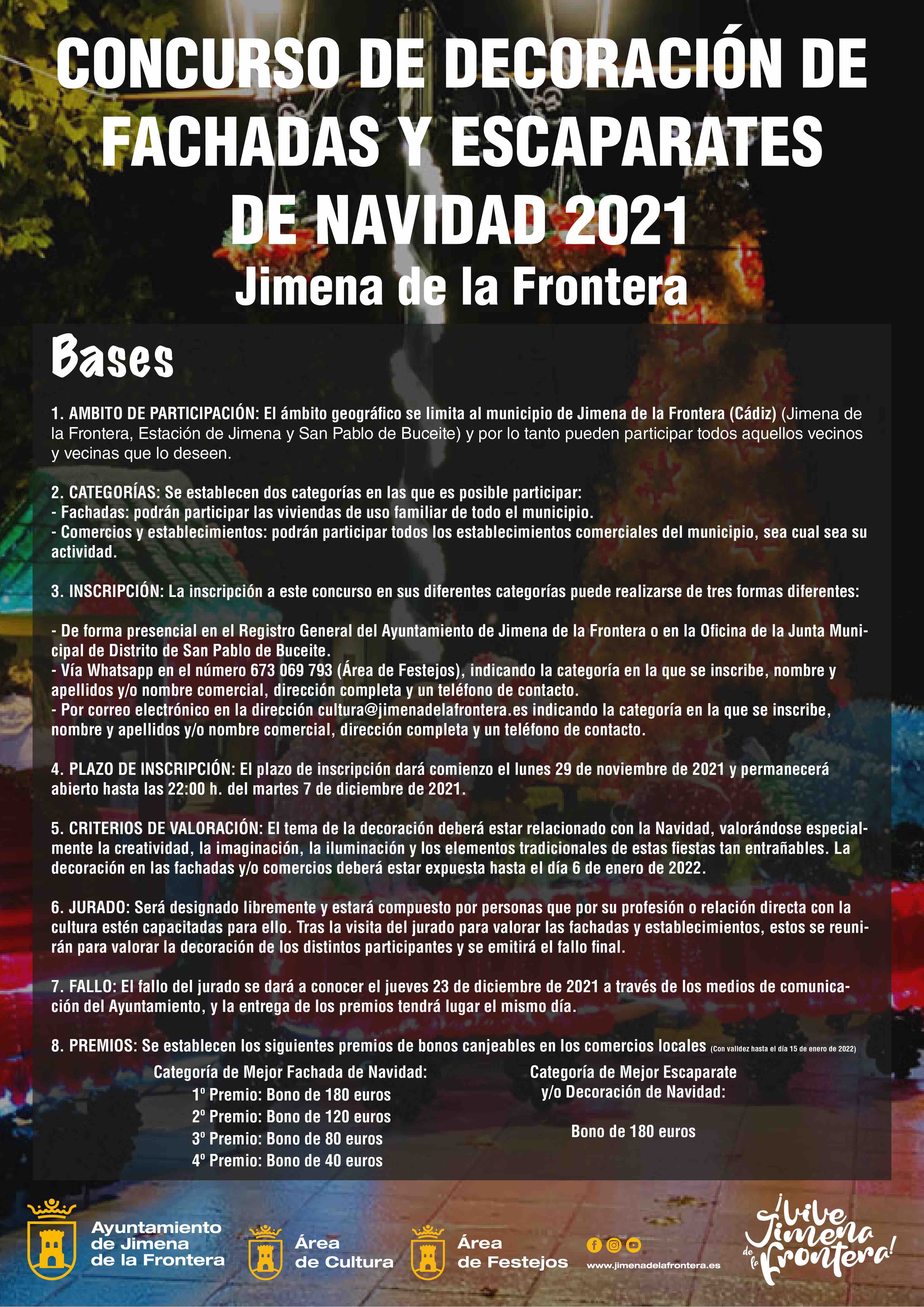 El Ayuntamiento de Jimena de la Frontera, a través de esta iniciativa de participación ciudadana de las áreas de Cultura y de Festejos, invita a todos los vecinos y vecinas a formar parte del segundo “Concurso de Decoración de Fachadas y Escaparates de Navidad de Jimena de la Frontera 2021”. Para ello, los interesados han de tener en cuenta las siguientes bases de participación: