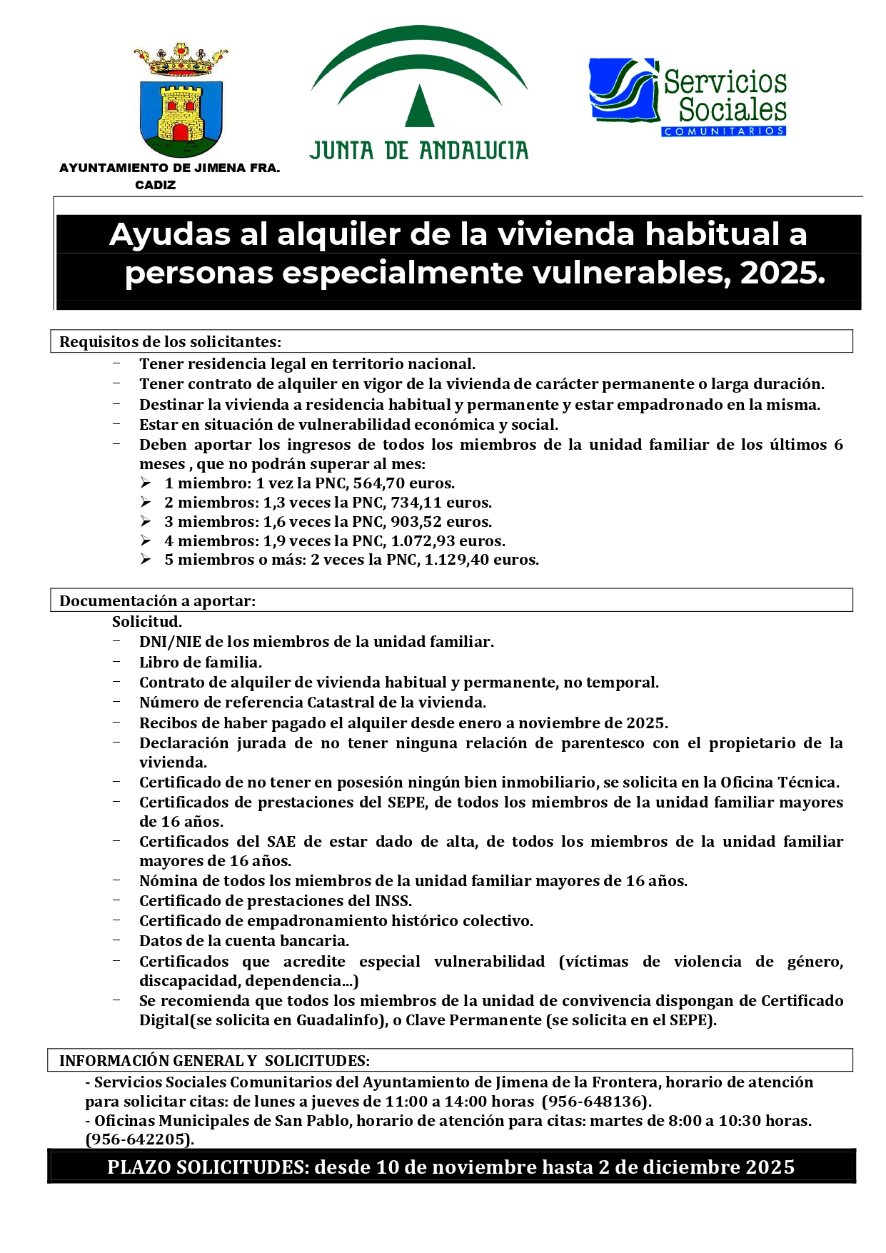 Desde el Ayuntamiento de Jimena de la Frontera publicamos las ayudas al alquiler de la vivienda 2025, un programa impulsado para ayudar a solventar la problemática de los costes del alquiler en personas vulnerables.