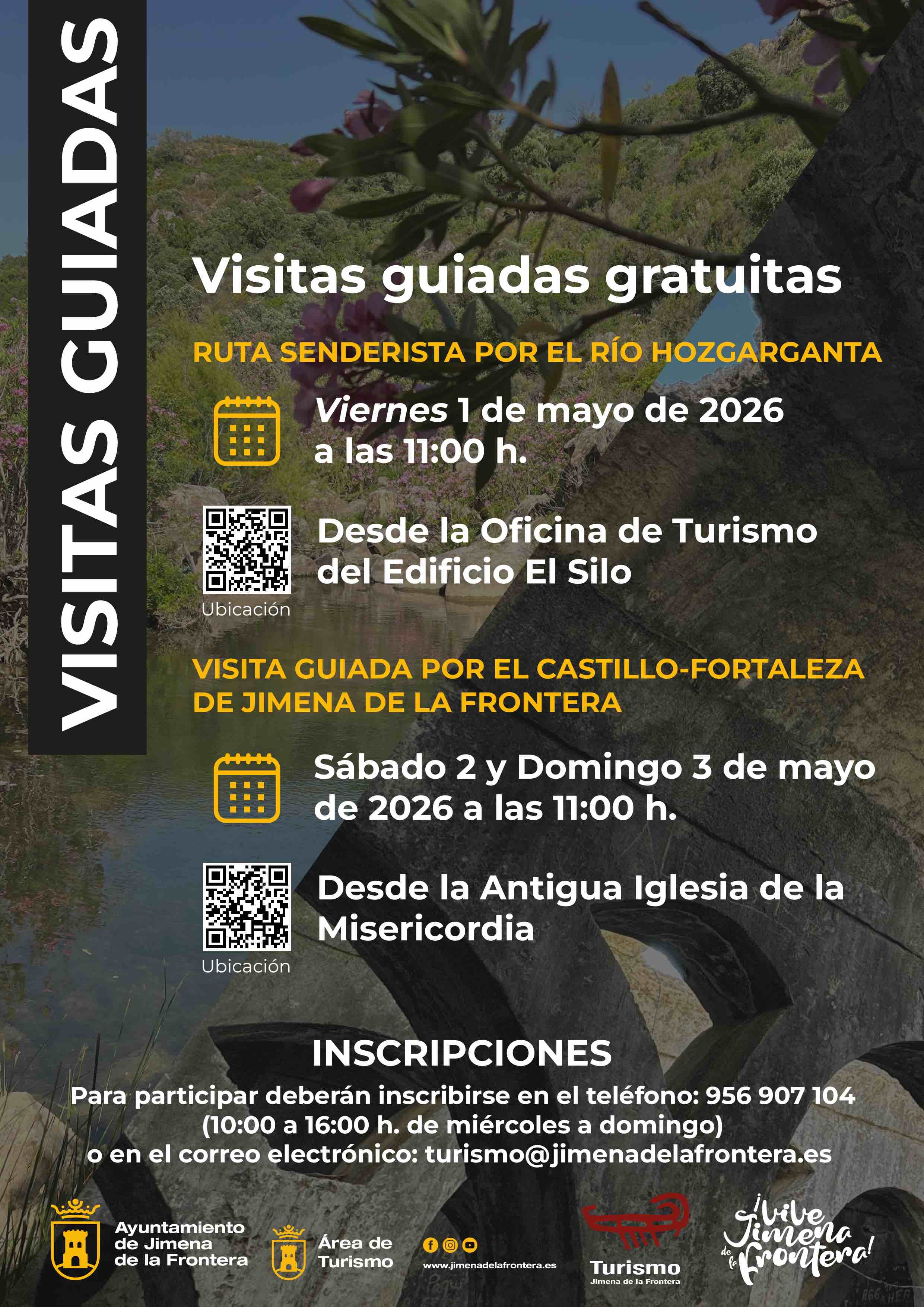 El Área de Turismo del Ayuntamiento de Jimena de la Frontera organiza tres actividades que consistirán en una ruta senderista por el río Hozgarganta, el viernes 1 de mayo de 2026, y dos visitas guiadas por el Castillo-Fortaleza el sábado 2 y domingo 3.