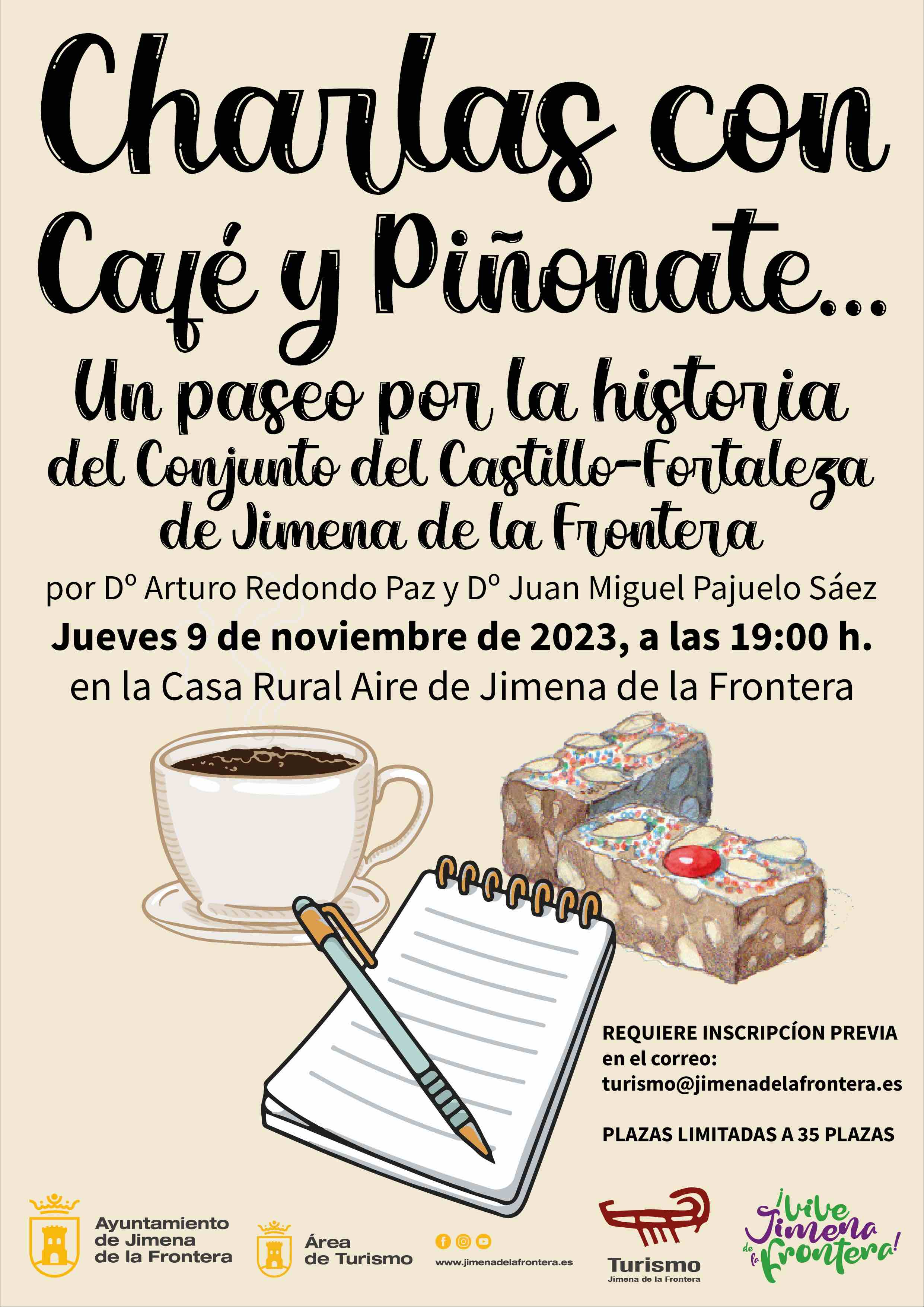 El Área de Turismo del Ayuntamiento de Jimena de la Frontera, dentro de la campaña de promoción del turismo local, ha organizado una serie de charlas científicas en alojamientos rurales bajo el título de ”Charlas con Café y Piñonate…”, con la finalidad de dar a conocer las diferentes instalaciones turísticas del municipio. En esta edición se han seleccionado temáticas relacionadas con la historia del entorno, en las que se expondrán los últimos y novedosos resultados de investigación de los trabajos que se están realizando en estos momentos en el municipio.