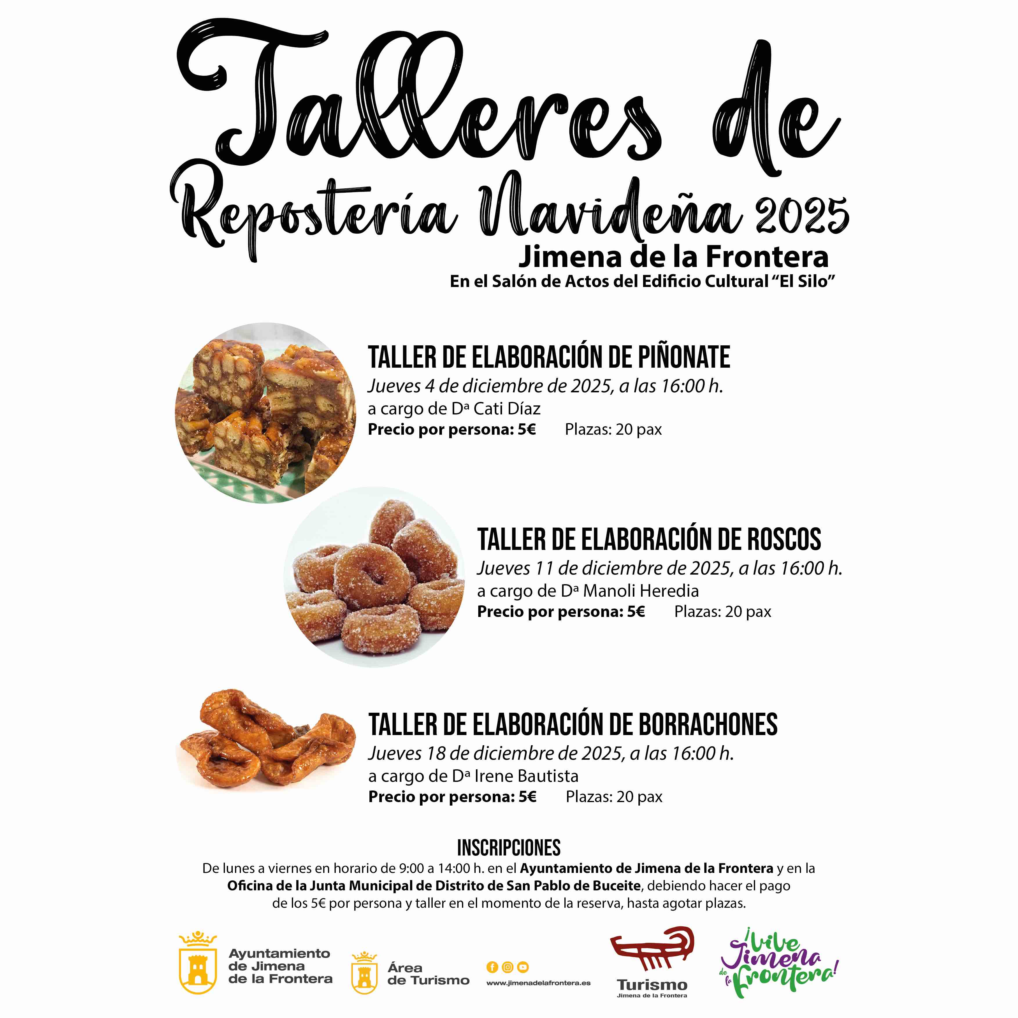 El Área de Turismo del Ayuntamiento de Jimena de la Frontera ha organizado tres talleres de elaboración de dulces típicos navideños de nuestro municipio, en los que podrán elaborar Piñonate, Roscos de Azúcar y Borrachones durante tres tardes de diciembre de 2025, en el Edificio Cultural “El Silo” de Jimena de la Frontera.