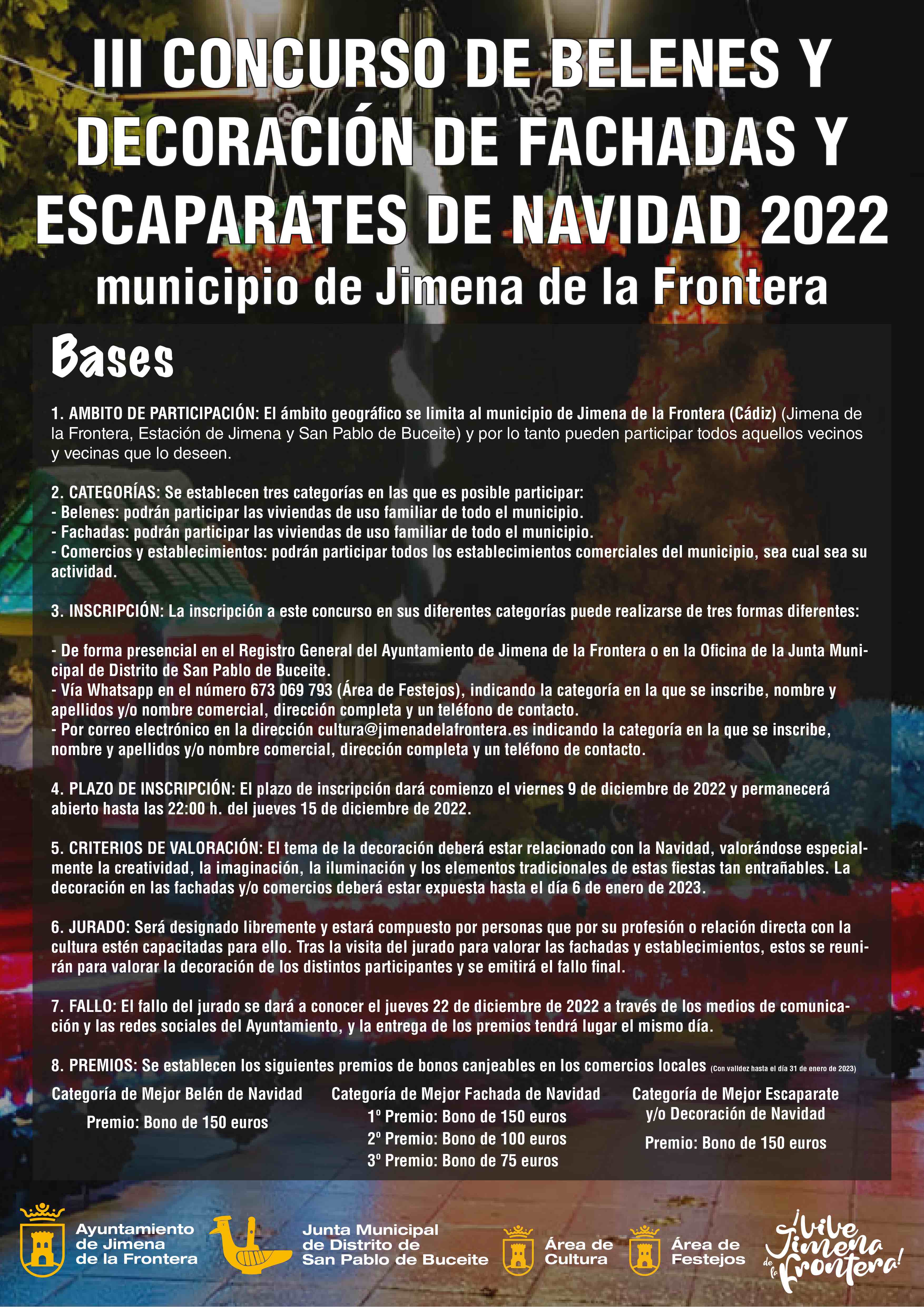 El Ayuntamiento de Jimena de la Frontera, a través de esta iniciativa de participación ciudadana de las áreas de Cultura y de Festejos, invita a todos los vecinos y vecinas a formar parte del tercer “Concurso de Belenes y Decoración de Fachadas y Escaparates de Navidad de Jimena de la Frontera 2022”. Para ello, los interesados han de tener en cuenta las siguientes bases de participación: