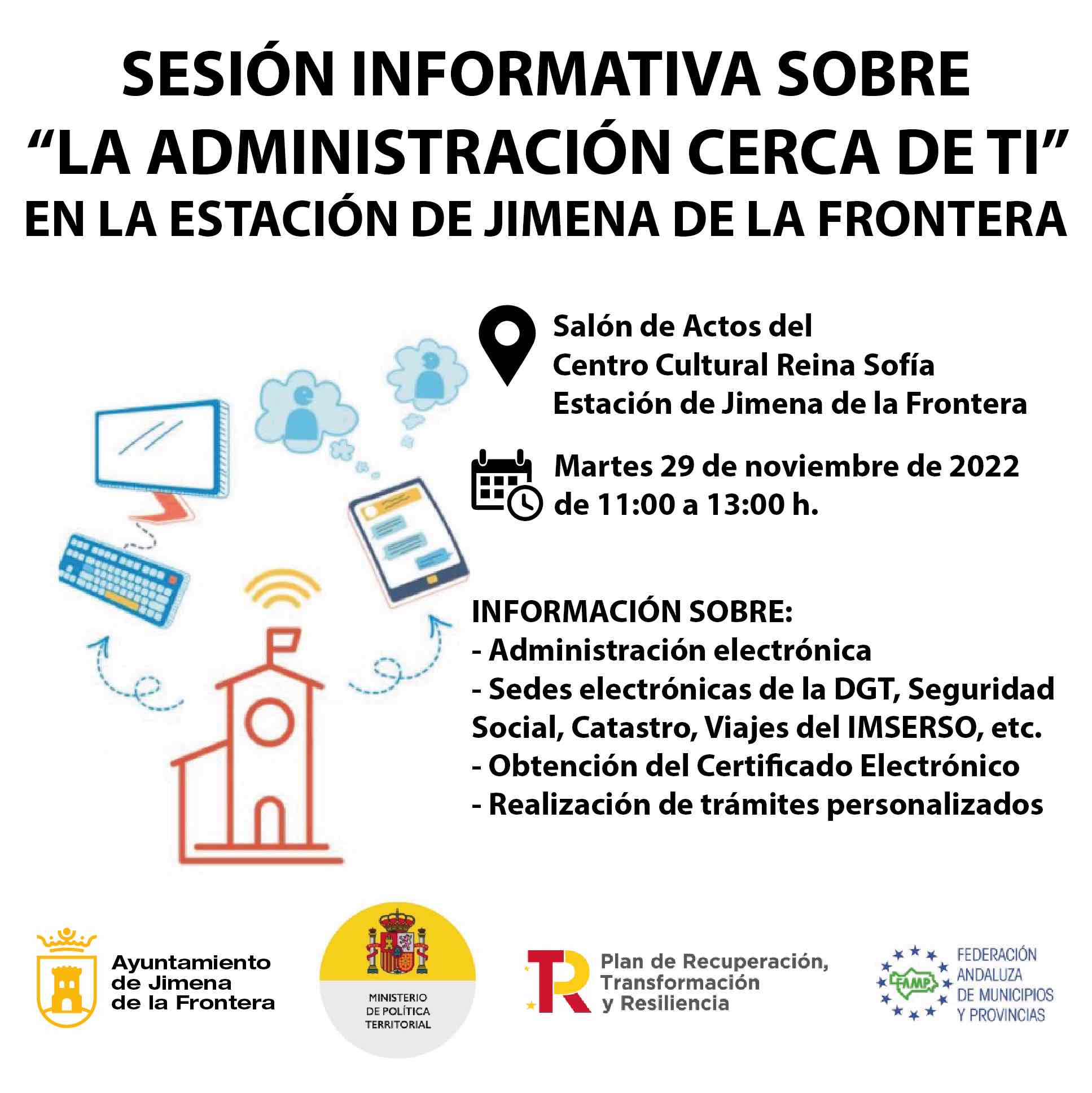 El martes 29 de noviembre de 2022, en horario de 11:00 a 13:00 h., en el Salón de Actos del Centro Cultural Reina Sofía de la Estación de Jimena de la Frontera, la Subdelegación del Gobierno en Cádiz llevará a cabo una jornada sobre la administración electrónica “La Administración cerca de ti”.