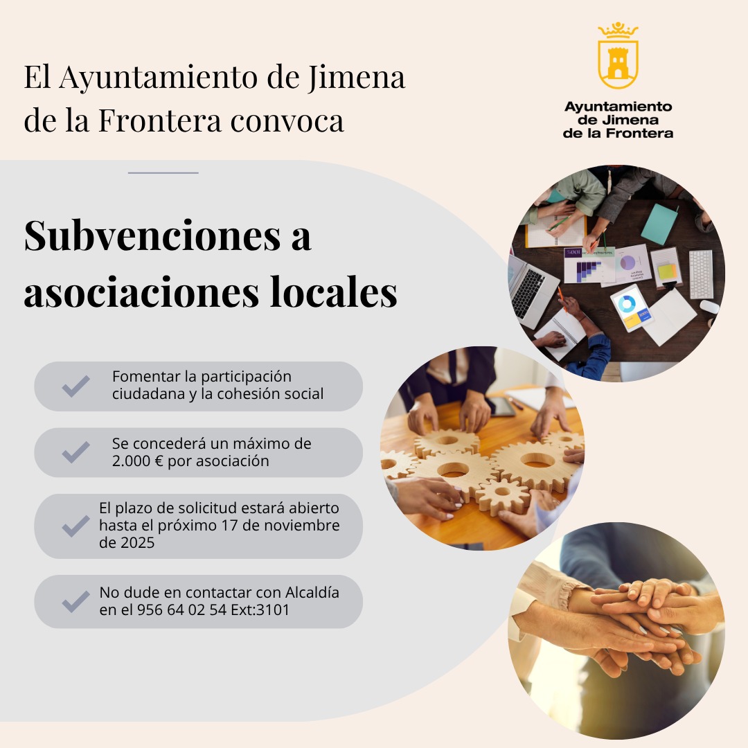 ℹ️ Desde el Ayuntamiento de Jimena de la Frontera somos conscientes del valor que aportan a nuestro municipio el trabajo constante de las asociaciones locales. Es por ello, y en aras de fomentar el asociacionismo como método de participación ciudadana y cohesión social, que se convocan estas subvenciones dirigidas a asociaciones sin ánimo de lucro y clubes deportivos con sede en el municipio de Jimena de la Frontera para financiar su funcionamiento y sus proyectos y/o actividades de interés social.
