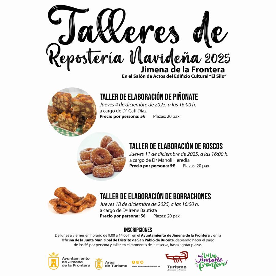 El Área de Turismo del Ayuntamiento de Jimena de la Frontera ha organizado tres talleres de elaboración de dulces típicos navideños de nuestro municipio, en los que podrán elaborar Piñonate, Roscos de Azúcar y Borrachones durante tres tardes de diciembre de 2025, en el Edificio Cultural “El Silo” de Jimena de la Frontera.