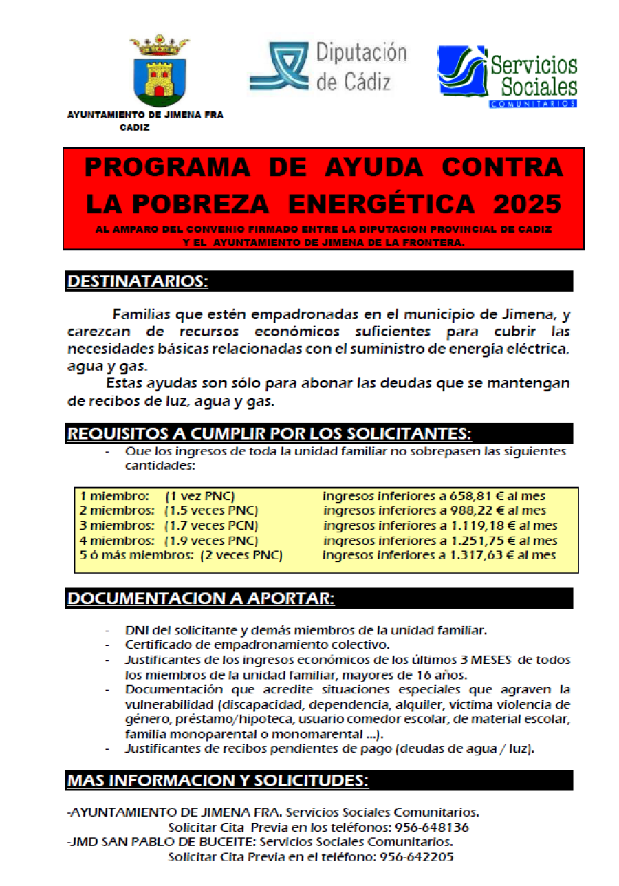 Desde el Ayuntamiento de Jimena de la Frontera publicamos las ayudas contra la pobreza energética 2025, un programa impulsado para ayudar a cubrir las necesidades básicas del suministro de energía eléctrica, agua y gas.