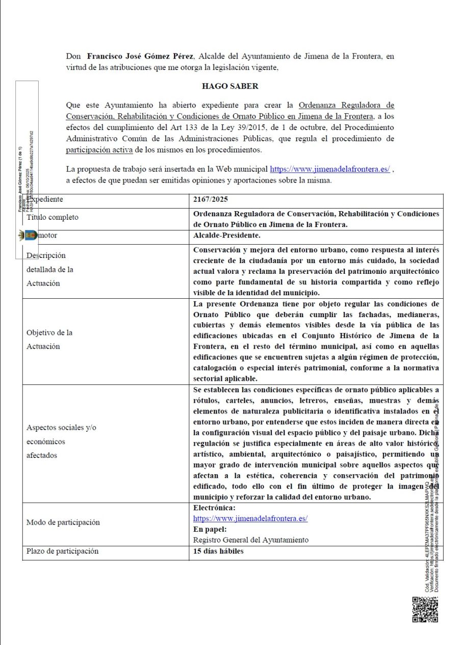 El Ayuntamiento de Jimena de la Frontera abre expediente para crear la Ordenanza Reguladora de Conservación, Rehabilitación y Condiciones de Ornato Público en Jimena de la Frontera para garantizar la conservación y mejora del entorno urbano.