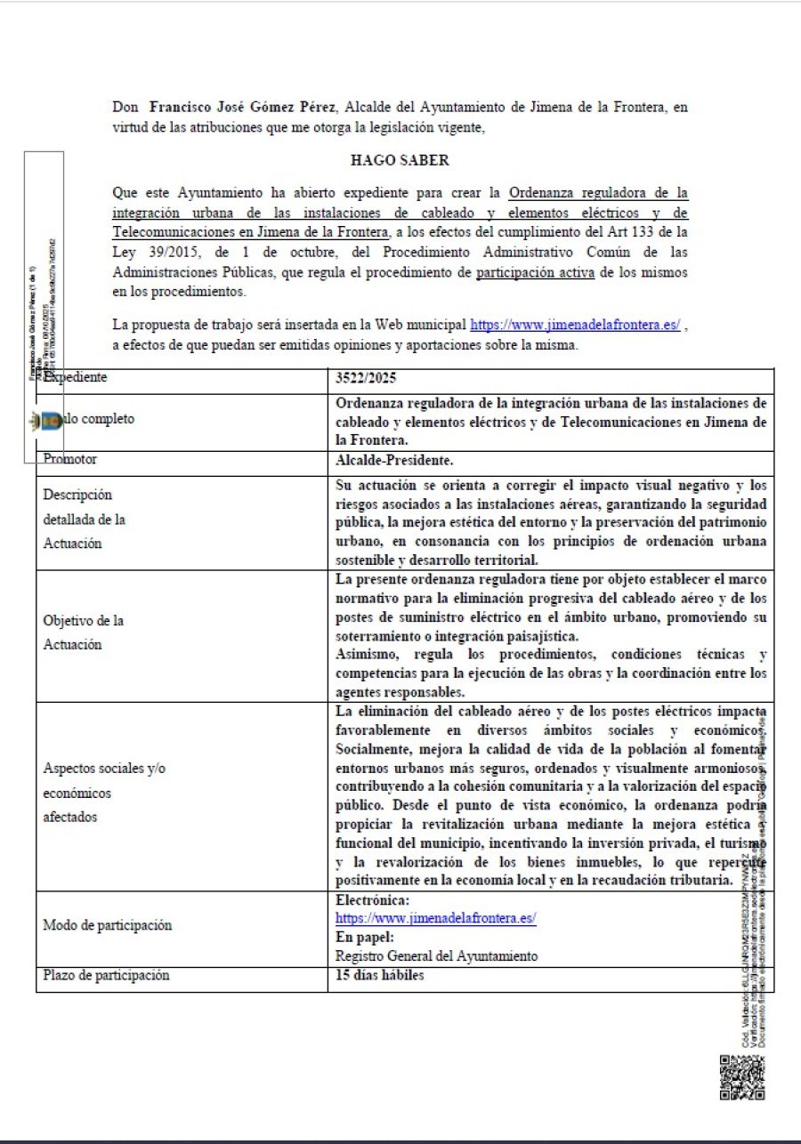 El Ayuntamiento de Jimena de la Frontera publica la creación de la ordenanza municipal por la que se regula la integración urbana de las instalaciones de cableado y elementos eléctricos y de Telecomunicaciones.