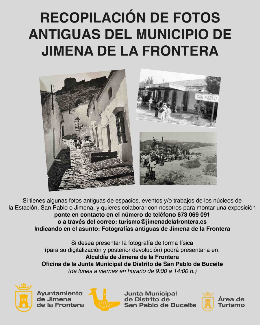 El Ayuntamiento de Jimena de la Frontera y la Junta Municipal de Distrito de San Pablo de Buceite, a través del Área de Turismo, invitan a todas las vecinas y vecinos de los tres núcleos de población -Jimena, Estación de Jimena y San Pablo de Buceite- a colaborar en la creación de una exposición colectiva dedicada a la memoria gráfica del municipio, que se ubicará de forma permanente en la Sala de Exposiciones del Edificio El Silo.