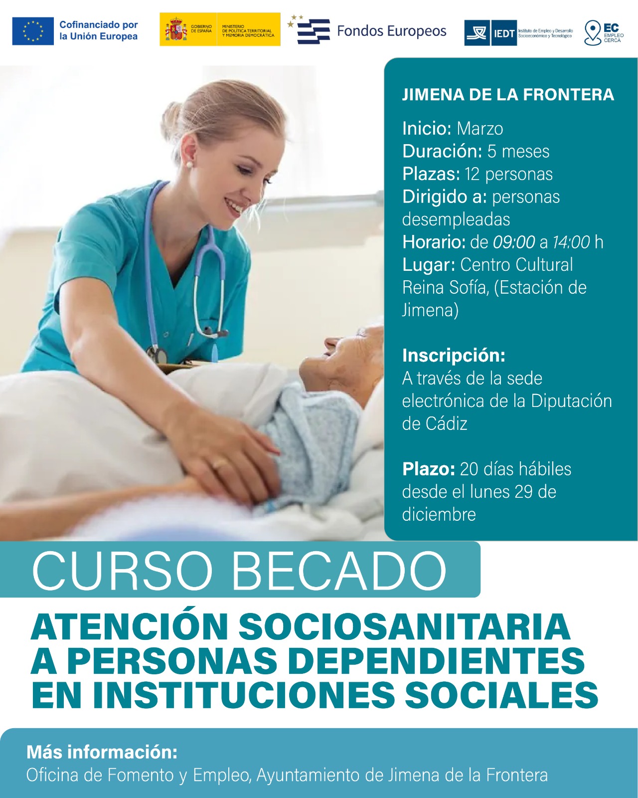El Ayuntamiento de Jimena de la Frontera publica la convocatoria del curso de ‘Atención Sociosanitaria a Personas Dependientes en Instituciones Sociales’ promovido por el Instituto de Empleo y Desarrollo Socioeconómico y Tecnológico de la Diputación de Cádiz y confinanciado por el Fondo Social Europeo.